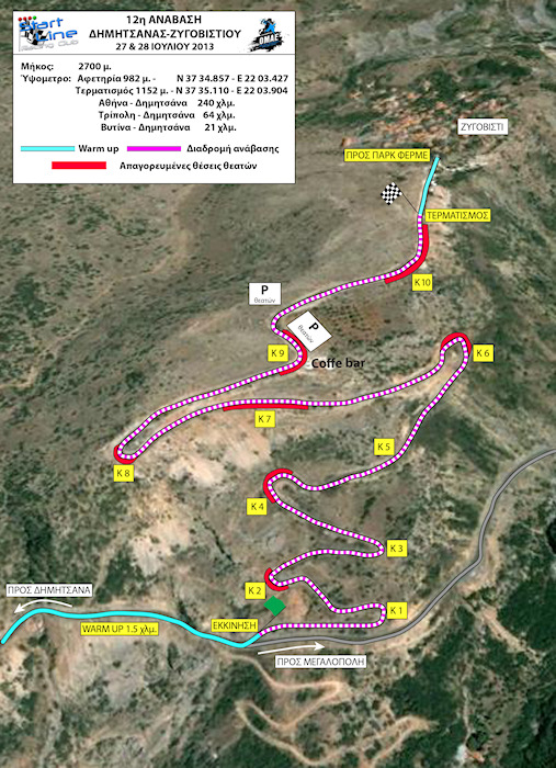 Ιουλίου 2013. Όλοι οι φίλοι αγωνιζόμενοι, οι δημοσιογράφοι και οι φίλοι του μηχανοκίνητου αθλητισμού θα απολαύσουν ένα ακόμα Σ/Κ στο κέντρο της Πελοποννήσου, σε μια πολύ ενδιαφέρουσα αγωνιστικά διαδρομή με υπέροχη θέα. |