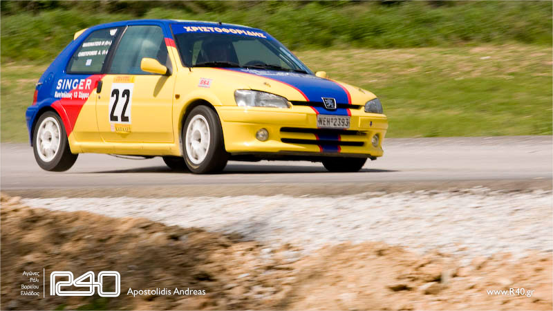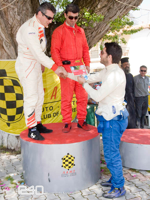Πετειναράκης-Κυριακίδου με Renault 5 GT Turbo. Στην κατηγορία των 2λιτρων, το πλήρωμα που ξεχώρισε και πήρε επίσης μια άνετη νίκη ήταν οι "Χριστόφορος"-Τηλιόπουλος με το γνωστό VW Golf II, που κινήθηκαν πολύ γρήγορα και κατάφεραν να κάνουν πολύ καλούς χρόνους που είχαν ως αποτέλεσμα και την "άτυπη" 3η θέση στη γενική μόλις 20'' πίσω από τους 2ους. Αυτό είχε και σαν αποτέλεσμα να ψηφιστούν από την ομάδα του R40 σαν "ΤΟ ΠΛΗΡΩΜΑ ΤΟΥ ΑΓΩΝΑ" για τον αγώνα των Σερρών. 2οι στην κατηγορία μετά από επίσης πολύ καλή εμφάνιση, οι Κοσμίδης-Κωνσταντινίδης με το Peugeot 306 S16 ενώ 3οι τερμάτισαν οι Κουτσμανής-Μαύρος με το Ford Fiesta ST της Ford Βροχίδης-Χατζής που και αυτοί έκαναν ακόμα μια καλή εμφάνιση. Την κατηγορία συμπλήρωσαν οι Κίτσος-Αχλαδάς με Opel Astra GSI, Τάσσος-Φυνδάνης με Renault Clio RS Ragnotti, Στόιλας-Φωτιάδης με Opel Ascona, Λάκης-Καμζέλης με Opel Manta, και Σώκος-Δημητρίου με Seat Ibiza GTI. Toν αγώνα τερμάτισαν και οι Χρυσαφίδης-Καστανιώτης με Opel Ascona που ήταν το ένα από τα 2 ιστορικά που συμμετείχαν στον αγώνα. Το άλλο ήταν οι Παρταλιός-Μπαλτουμάς με το BMW 2002 Ti που εγκατέλειψαν. Στα 1600 είχαμε την μεγάλη μάχη της ημέρας. Πρωταγωνιστές 2 πληρώματα, οι Μπιλαδέρης-Μπιλαδέρης με Honda Civic VTI και οι τοπικοί Χριστοφορίδης-Μακινατζής με Peugeot 106 S16. Στο 1ο σκέλος η διαφορά ήταν μόλις 1''3 υπέρ του Χριστοφορίδη, αλλά στο 2ο σκέλος ο Μπιλαδέρης σημείωσε εκπληκτικό χρόνο (4ο γενικής) που τους έδωσε μια εντυπωσιακή νίκη. 3οι στην κατηγορία, οι Ευθυμιάδης-Παπανικολάου με το Peugeot 106 S16 συνεχίζοντας τις πολύ καλές φετινές τους εμφανίσεις. Μεγάλη μάχη και για την 4η θέση στην κατηγορία όπου οι Μήτρακας-Μέρμυγκα με Citroen Saxo VTS επικράτησαν των Καραβασίλη-Τσαμαγδά με ίδιο αυτοκίνητο για μόλις 0''1! Την κατηγορία συμπλήρωσαν οι Γιάννος-Ράλλης με Honda Civic, Σανιδάς-Κεχαγιάς με Peugeot 106 S16, Tαυλίκος-Τάτσιος με Peugeot 106 S16 και Κώστας-Τσιμπίδης με Peugeot 205. Στα 1400, οι τοπικοί Λίθαρης-Χαβαλές με ένα Τοyota Yaris κέρδισαν εύκολα την κατηγορία εμπρός από τους Νιζάμη-Νιζάμη με Skoda Felicia KC, ενώ την πρώτη 3άδα έκλεισαν οι Γεωργούσης-Λέφας με Suzuki Swift. Πίσω τους τερμάτισαν οι Κολοκοτρώνης-Μέρτικας με Toyota Starlet, Μάστορας-Σαμιώτης με Peugeot 106 Rallye, και Ταμπακόπουλος-Γαγάκας με Peugeot 205 Rallye. Oι εγκαταλείψεις ήταν λίγες στον αγώνα, μεταξύ αυτών, οι Παρταλιός-Παπαδόπουλος από κινητήρα, Πατσιάς-Θωμόπουλος από μπιέλα, και Κατσιώνης-Κατσιώνης από έξοδο. Ο αγώνας είχε καλή οργάνωση, στα συν η πανηγυρική εκκίνηση του Σαββάτου που μάζεψε αρκετό κόσμο, αντιθέτως με σήμερα και μάλλον αυτό οφείλεται στην απουσία αρκετών εκ των πρωταγωνιστών των αγώνων στη Β.Ελλάδα που προτίμησαν να μην συμμετέχουν στον συγκεκριμένο αγώνα. Επόμενος αγώνας για το Κύπελλο Βορείου Ελλάδος, στις 21 Ιουνίου, με το ασφάλτινο Ράλι Δημόκριτος στην περιοχή της Αλεξανδρούπολης.   Δείτε τα αναλυτικά αποτελέσματα