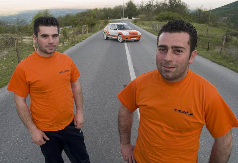 Στο ράλι Θερμαϊκού, που ήταν ο δεύτερος αγώνας για το Βορείου Ελλάδος, είχαμε την συνέχεια του "πληρώματος του αγώνα". Αν και οι υποψήφιοι ήταν αρκετοί, ο τίτλος πήγε στο πλήρωμα με το λευκό-πορτοκαλί 205, τους Γιάννη και Βαγγέλη Κωνσταντινίδη. Έτσι, μετά το τέλος του αγώνα, κανονίστηκε μια συνάντηση για να τους γνωρίσουμε καλύτερα. Ορίστηκε ημερομηνία και μέρος, και έτσι βρεθήκαμε ένα απόγευμα σε μια καταπληκτική διαδρομή πάνω από τη Γουμένισσα.  Ποιοι είναι όμως? Ο Γιάννης και ο Βαγγέλης, 28 και 23 ετών αντίστοιχα. Κατάγονται από τα Γιαννιτσά όπου διαμένουν και εργάζονται. Κατασκευάζουν και επιδιορθώνουν ψυγεία για μηχανές στην οικογενειακή επιχείρηση και το μεγαλύτερο μέρος του ελεύθερού τους χρόνου, το ξοδεύουν στους αγώνες. Πέρσι ήταν οι τυχεροί του λαχνού του ΣΟΑΑΒΕ, όπου κέρδισαν τις συμμετοχές ολόκληρου του 2007, με αποτέλεσμα να μπορέσουν να εξελίξουν ένα μικρό τερατάκι. Ας δούμε τι μας είπαν:  |