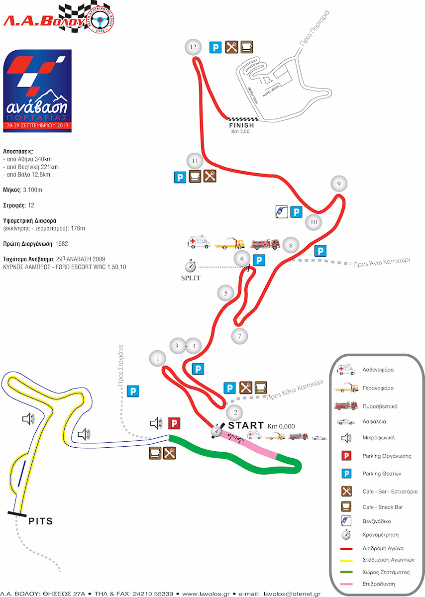 Όπως συνηθίζεται, το Σάββατο 28 Σεπτεμβρίου ξεκινά με τον τεχνικό έλεγχο των αυτοκινήτων ο οποίος θα διεξαχθεί μπροστά στο Ξενοδοχείο Ξενία της Πορταριάς από ώρα 08:00 – 11:00 και εν συνεχεία οι χρονομετρημένες δοκιμές του αγώνα στις 12:30, ενώ την Κυριακή 29 Σεπτεμβρίου στις 10 το πρωί, το πρώτο αγωνιστικό αυτοκίνητο θα πάρει εκκίνηση.